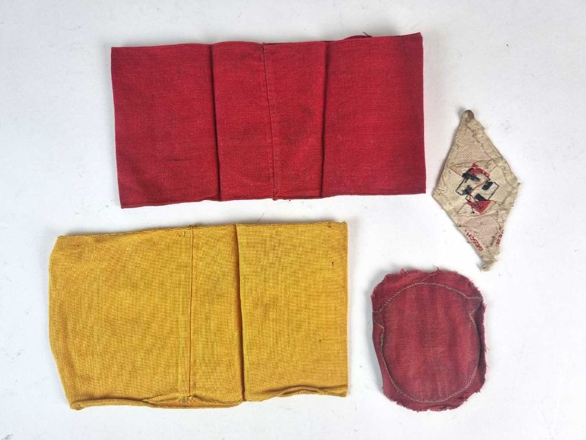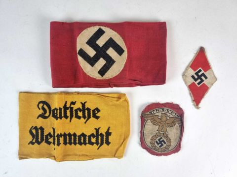 comprising a Deutsche Wehrmacht armband, machine-embroidered with gothic script against a yellow ground, sewn together; an NSDAP party member's armband, red cotton affixed with a white circle with black swastika, sewn together; a Hitler Youth/BDM Bevo woven sports vest or arm badge; and an N.S.K.K eagle cut from a vehicle pennant