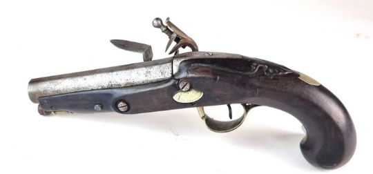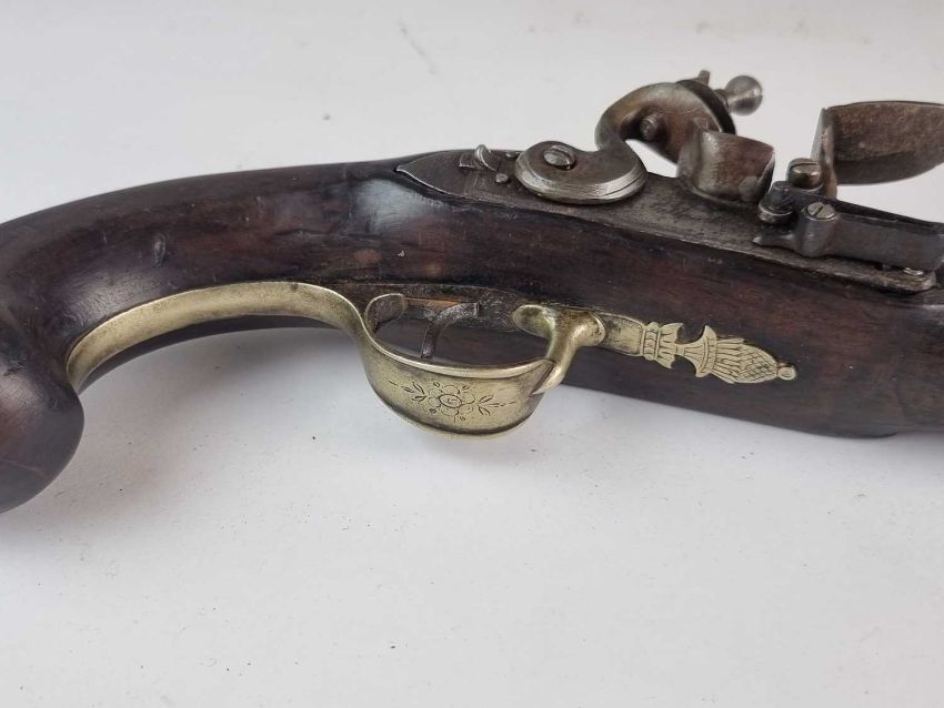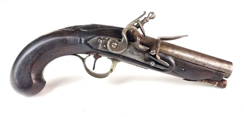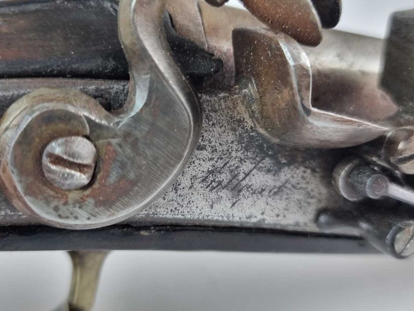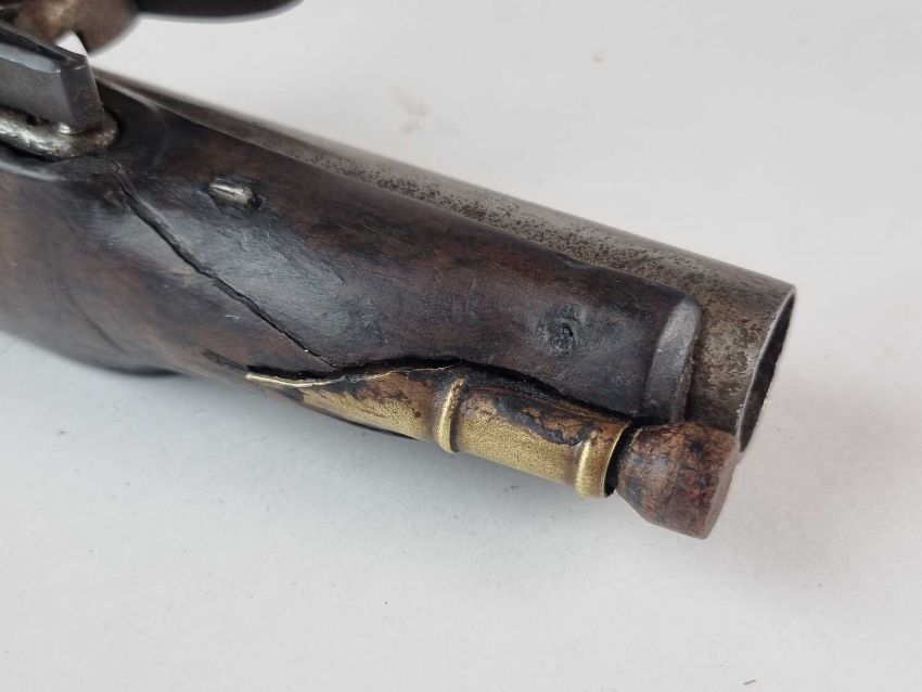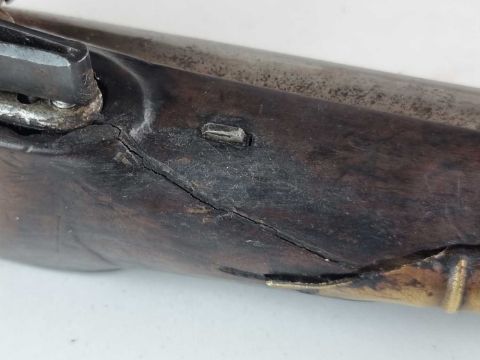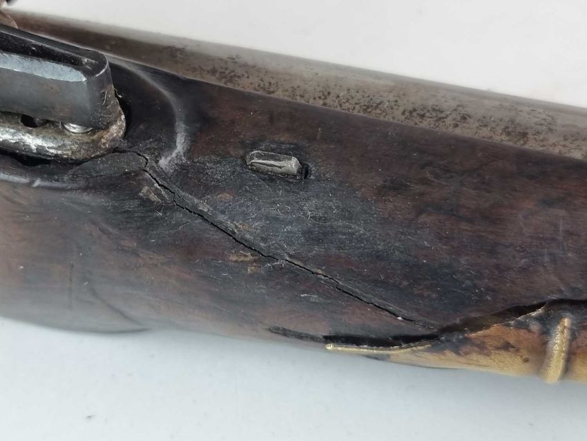 Will cock, hold and fire correctly. Pitting and some corrosion to the metal elements. Crack to one side of the stock, extending from just forward of the frizzen spring through to the ramrod holder. The opposite side has a smaller crack near the end of the barrel. Some general dings and dents but the shell moulding is in good order.
