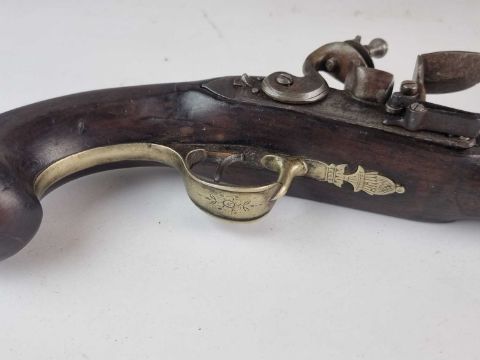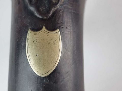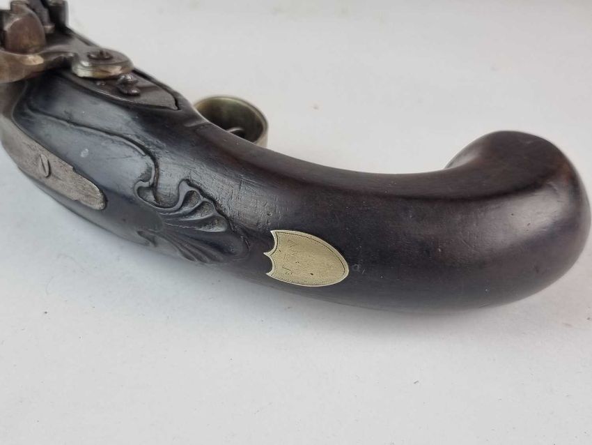 A Thomas Ketland & Co flintlock 12-bore travelling pistol, circa 1800, 5.5" barrel, faintly engraved 'Ketland', with Paktong mounts, trigger guard in the form of an acorn, the butt with a scallop shell and a shield-shaped escutcheon bearing initials 'J W', wooden ramrod, overall length 29cm.