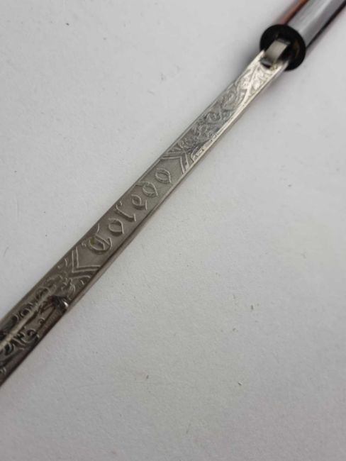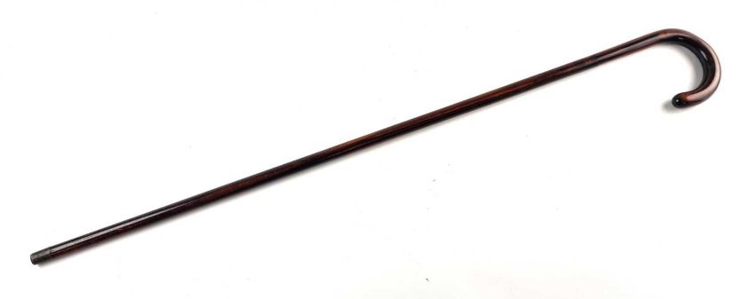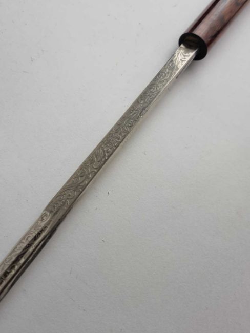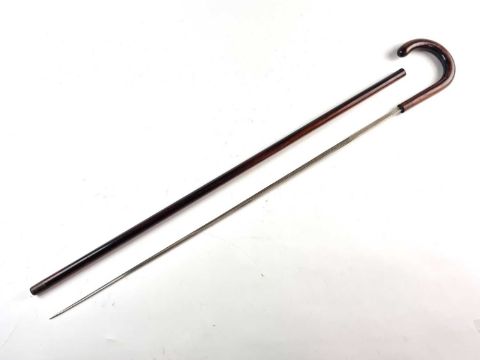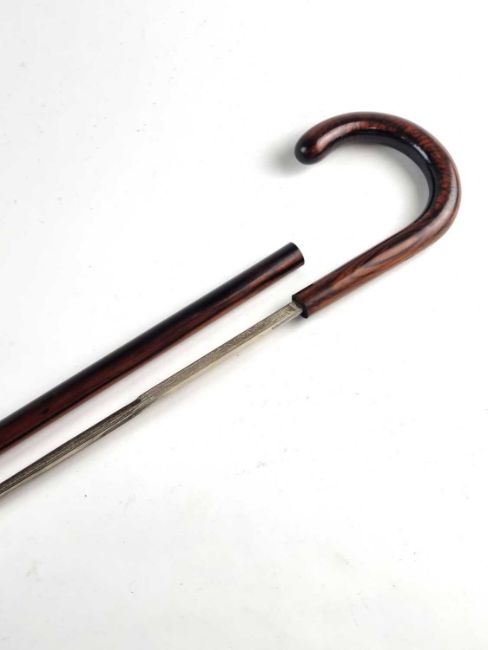 A late 19th/early 20th century hardwood gentleman's sword cane, the twist-lock handle opening to reveal a 69cm blade marked 'Toledo' and etched with scroll embellishment, overall length 91cm