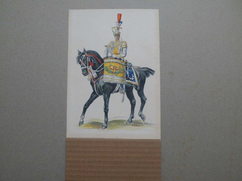 Attributed to Richard Knötel (1857-1914), Kettle Drummer of the French 2nd Empire Army c. 1860, watercolour, unsigned, 194mm x 130mm, 302mm x 234mm (framed); together with Percy White (20th century), Guidon Bearer Gendarme Anglais, 1764, signed and titled, 198mm x 142mm, 307mm x 248mm framed, a letter from the artist within the back of the frame. (2)