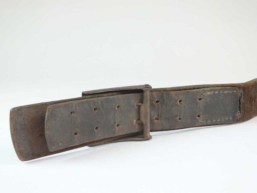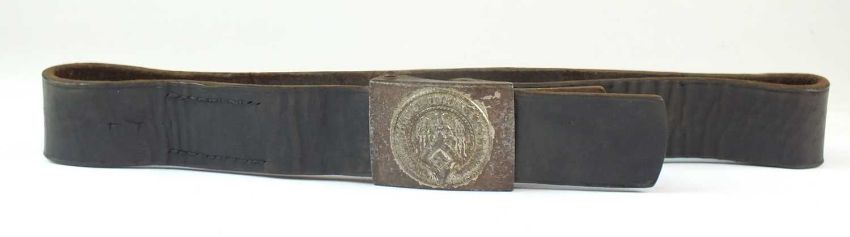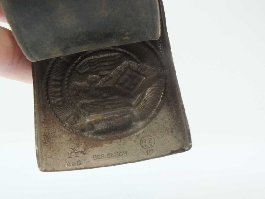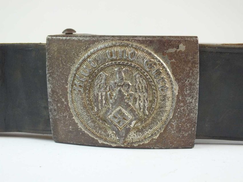 A German Third Reich Hitler Youth belt with buckle, the buckle by Assman & Sohne, with inscription “Blut und Ehre” (Blood and Honor) above an eagle clutching a Hitler youth diamond, maker marked 'RZM 17' with A&S logo.