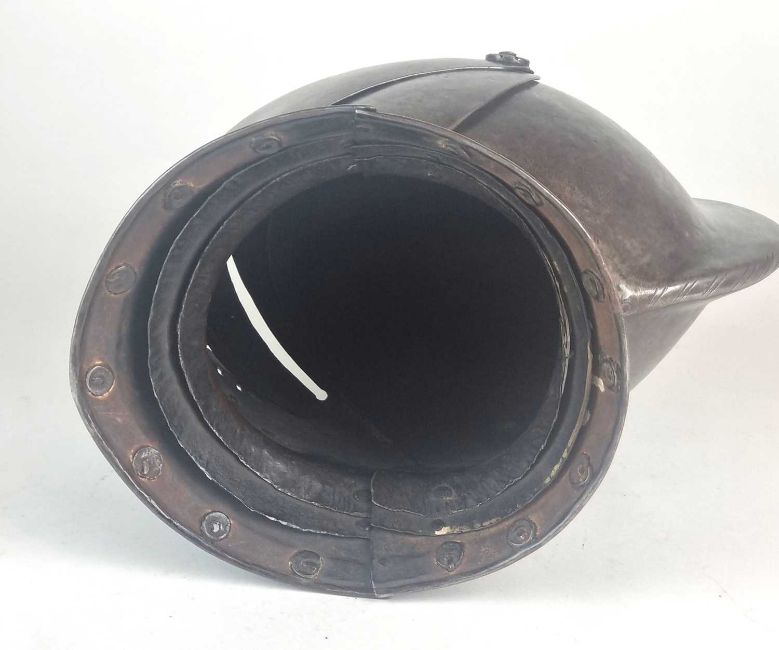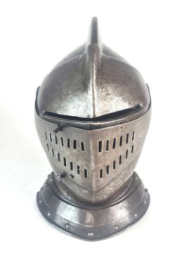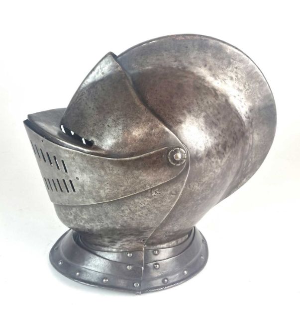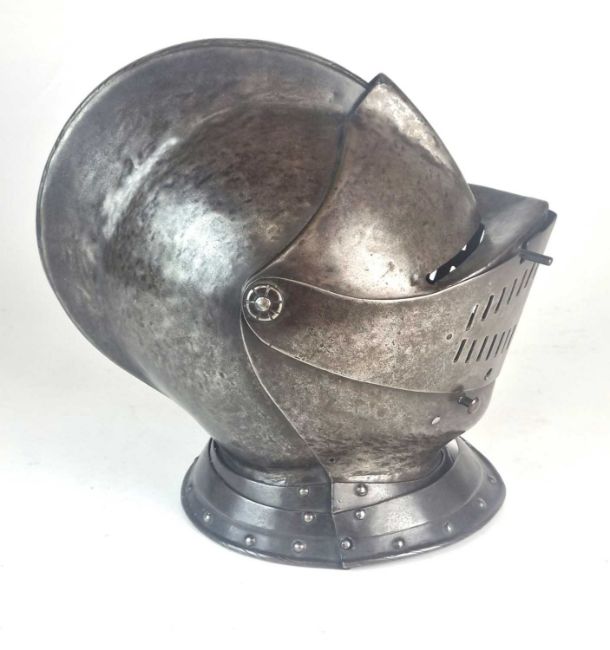 A late 16th/early 17th-century North European composite close helmet with a later neck guard and visor, the visor with elongated sights, two-piece skull with a high medial roped comb, the upper bevor pierced horizontally elongated ventilation slots to either side, two-piece gorget with roped edges.
