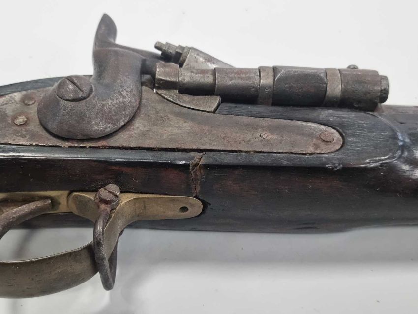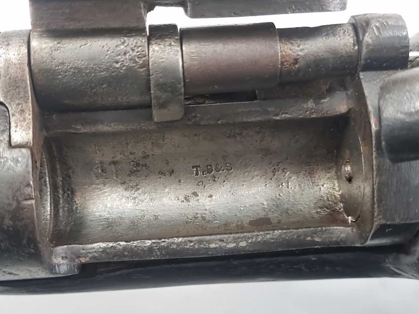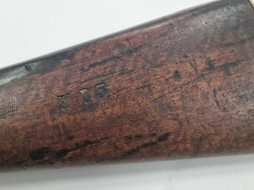no visible markings to lockplate, barrel with inspections and other markings, stock inscribed '115', interior of hinged block stamped "T.B & S", barrel 35.5", overall length 54", lacking ramrod