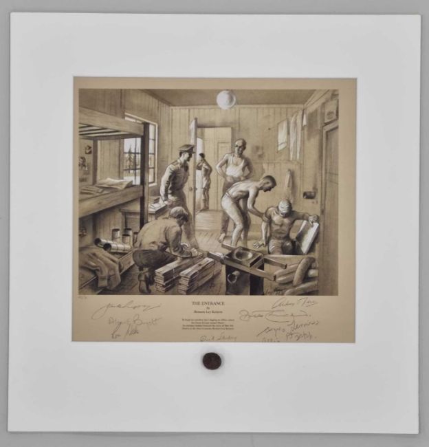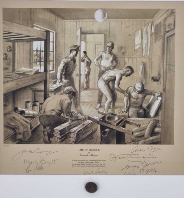signed by Flt Lt Alan Bryett, Sqn Ldr Dick Churchill, Flt Lt Dick Starkey and others, conservation matted to include a prisoners brass uniform button found in the area of Hut 104, print print 38cm x 35cm, overall dimensions 45 x 46cm