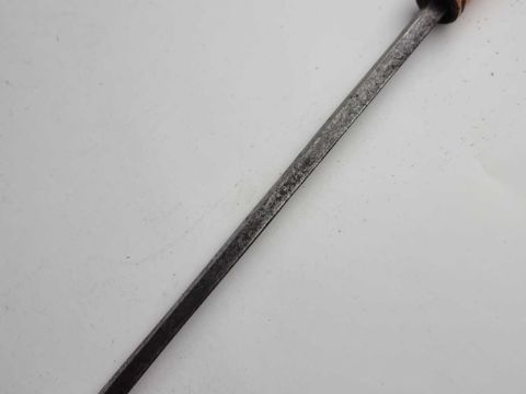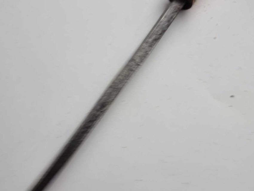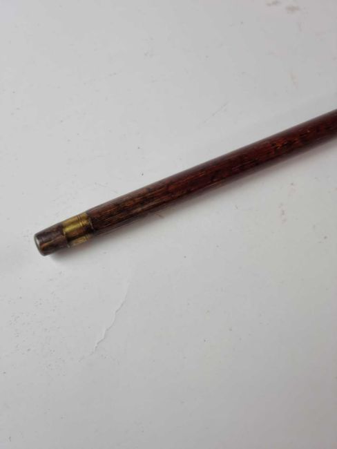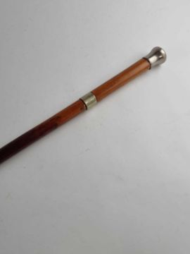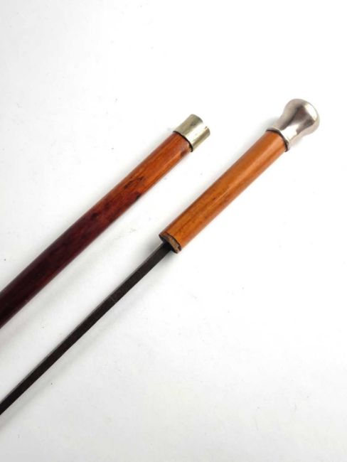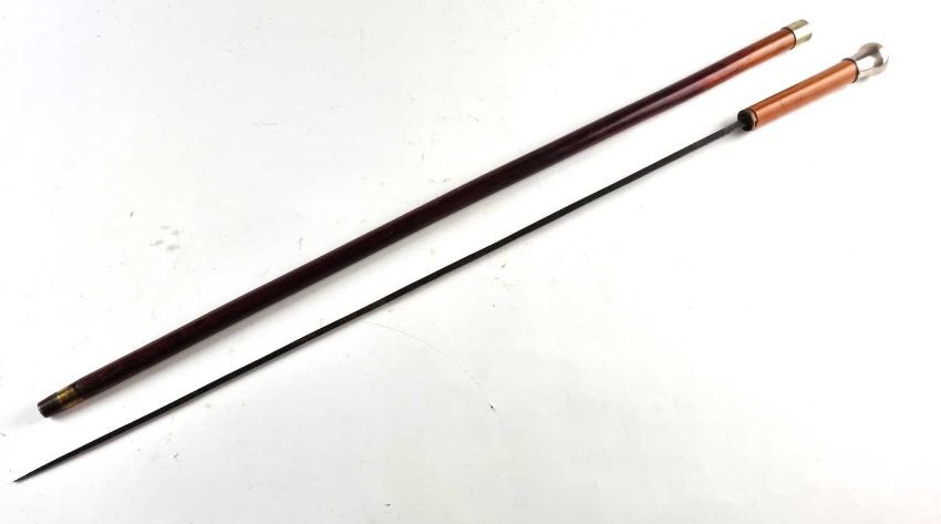 A late 19th/early 20th-century malacca sword cane with a white metal pommel and collar, opening to reveal a 66cm blade, overall length 92cm