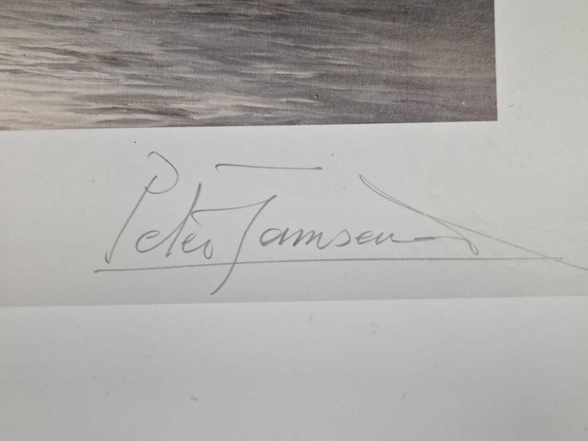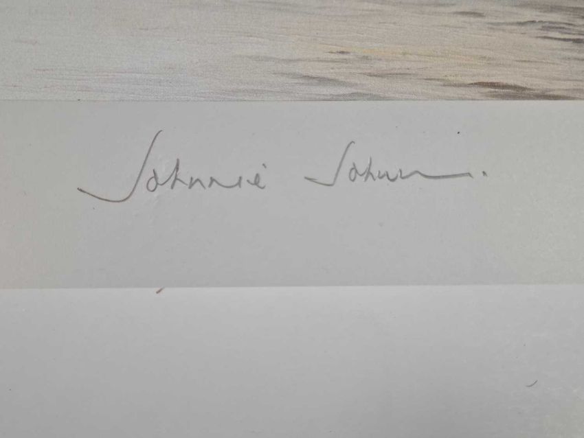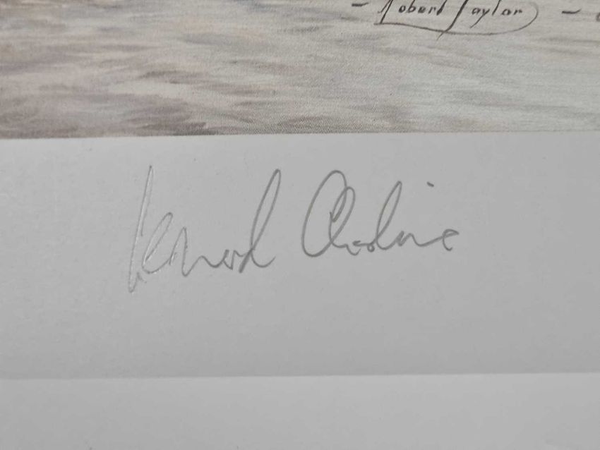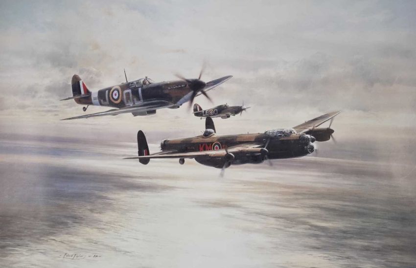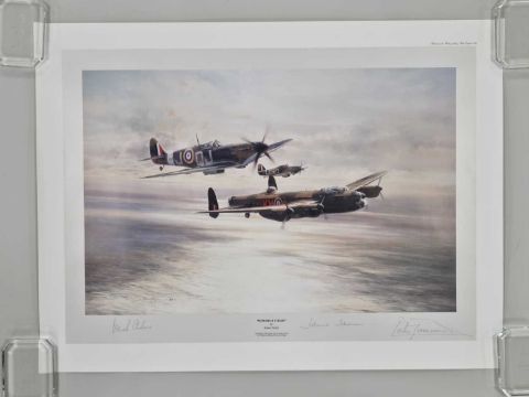 Memorial flight, coloured print, signed by Leonard Cheshire, Johnnie Johnson and Peter Townsend, overall dimensions 66 x 52cm including margins