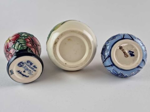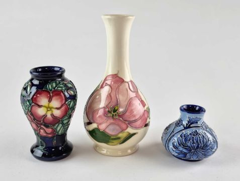 Three small Moorcroft vases, comprising a floral example designed by Anji Davenport, dated 1999, 10cm high; a 'Magnolia' on cream bud vase and a miniature blue Florian vase, dated 1993, 5.5cm high. All boxed. (3)