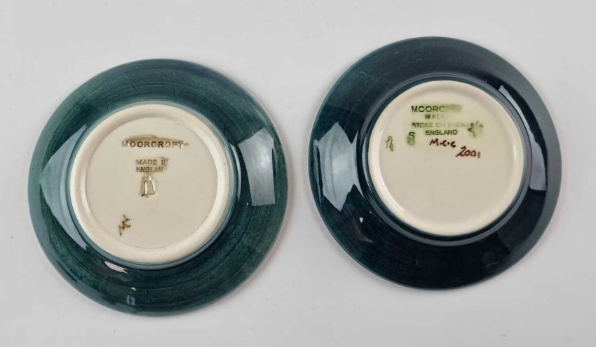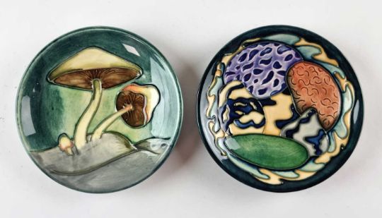 Two Moorcroft pin dishes; 'Fairy Rings', dated 1991 and 'Rockpool', a Collector's Club piece dated 2001, painted and impressed marks, both 11.5cm diameter. Unboxed.