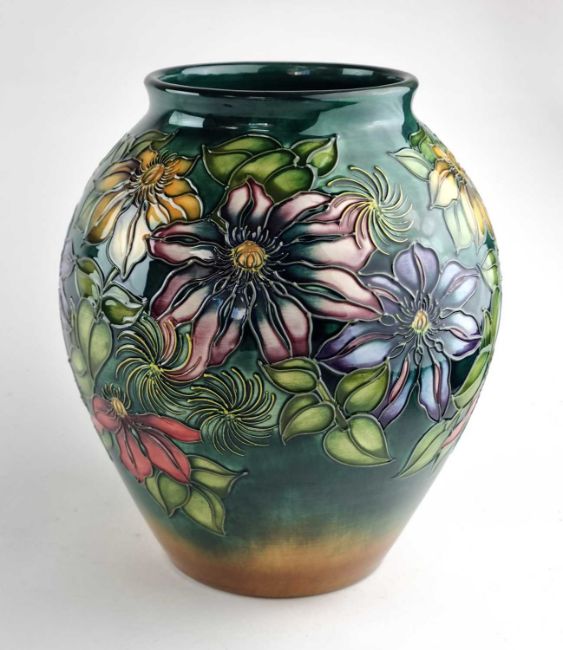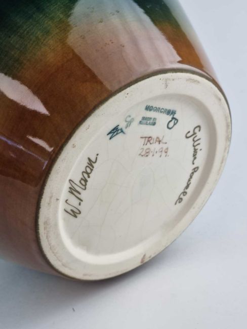A Moorcroft Trial vase in the 'Royal Tribute' (dark green to brown) vase, dated 1999, signed by Gillian Powell, painted and impressed marks, 27.5cm high. Unboxed.