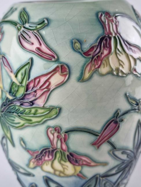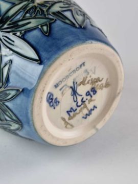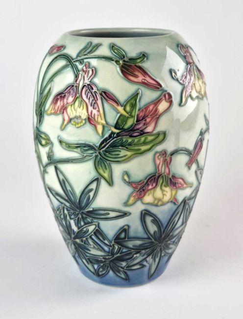 An uncommon Moorcroft Collector's Club 'Aquilegia' vase, dated 1998, painted and impressed marks and two gold signatures, 18.5cm high. Boxed.
