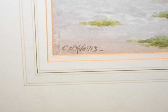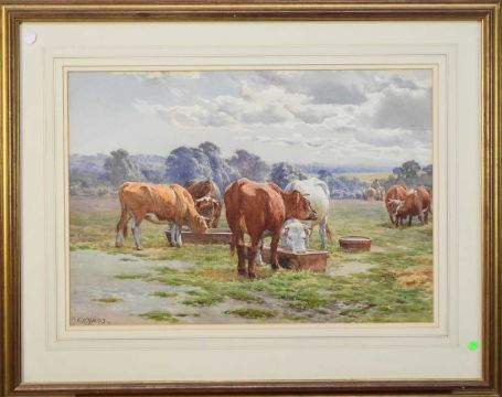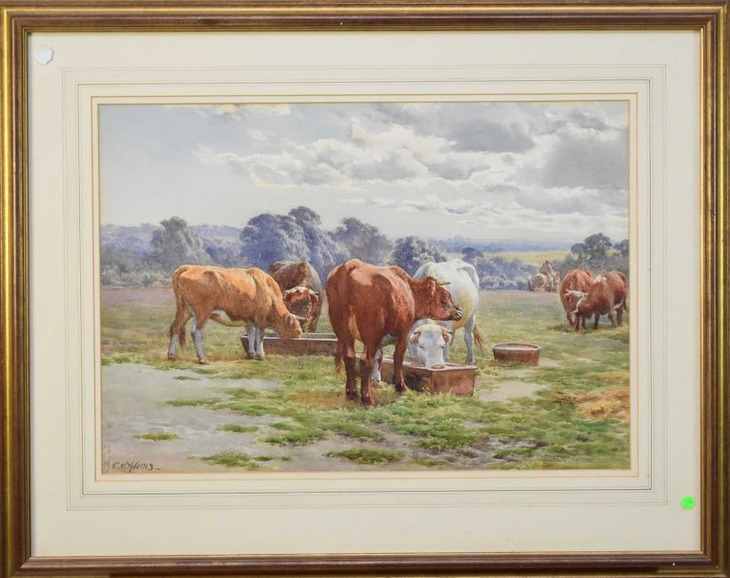 Charles James Adams (1859-1931) Thirsty, cattle watering, signed lower right, watercolour, 37.5 x 53.5 cm, frame 60 x 75 cm