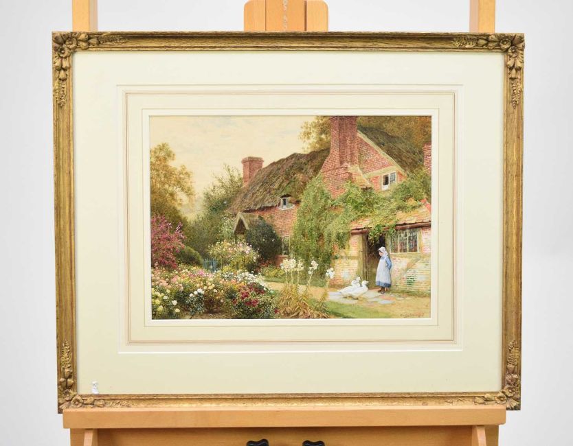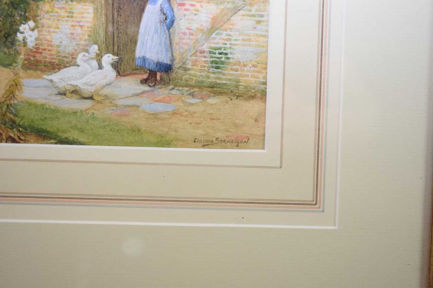 Claude Strachan (1865-1938) The Geese Came Visiting, signed lower right, watercolour, 26 x 36 cm, frame 48 x 59 cm