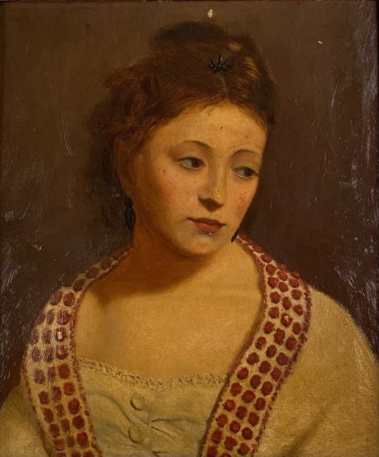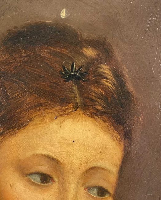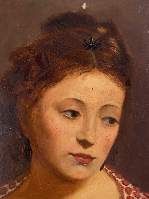 Attributed to Albert Moore (1841-1893) Head and Shoulder Portrait Study of a Young Girl, oil on board, possible monogram visible in the hairpiece, 30 x 26 cm, frame 33 x 28 cm