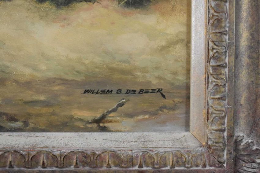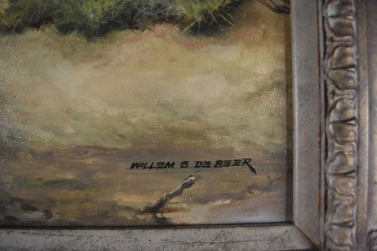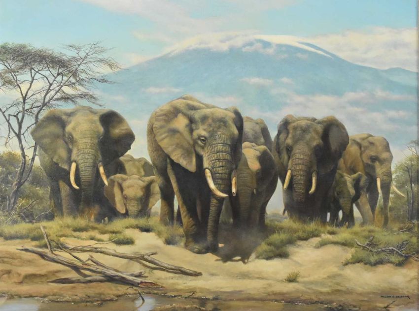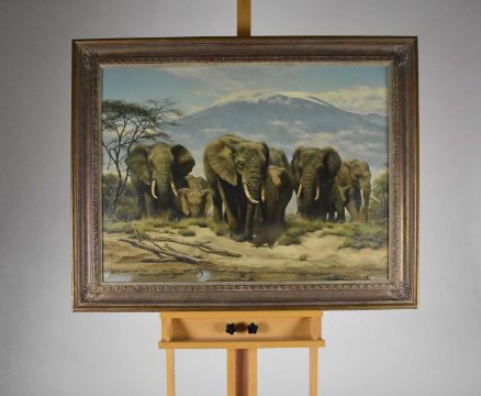 Willem Sternberg de Beer (South African b.1941) The High and Mighty, herd of elephants approaching water, signed lower right, oil on canvas, 76 x 102 cm, frame 95 x 120 cm