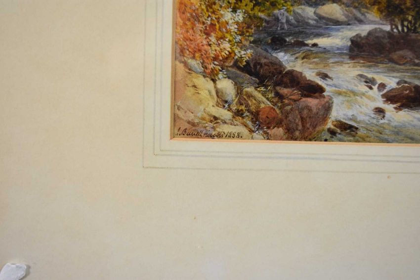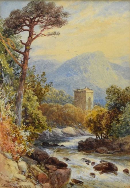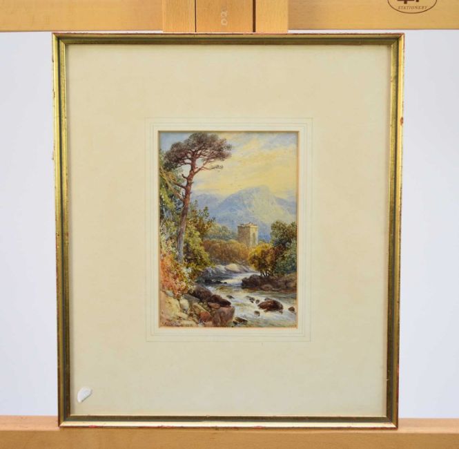 James Burrell Smith (1822-1897) Continental River Scene with Angler on the Rocks, fortified tower before a mountainous landscape beyond, signed and dated 1888 lower left, watercolour, 17 x 12 cm, frame 34 x 30 cm