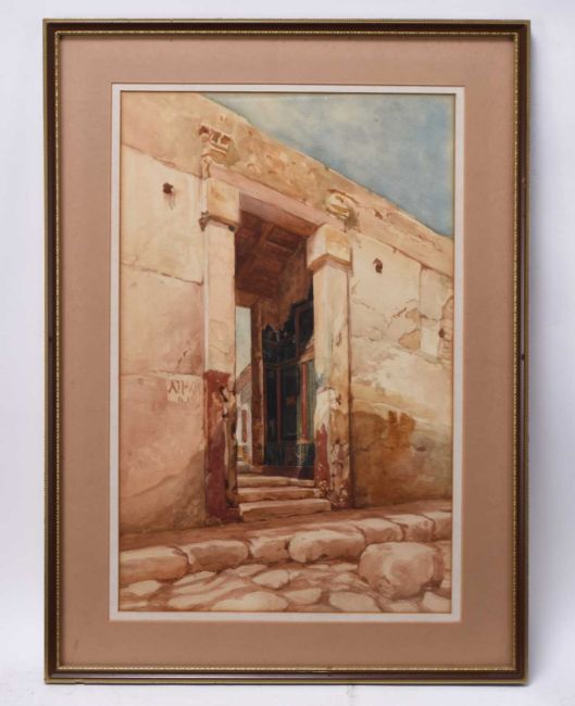 After Luigi Bazzani (1836-1927) Entrance to the House of Aulus Vetius, Pompeii, watercolour, 44.5 x 28.5 cm, frame 57 x 41 cm
