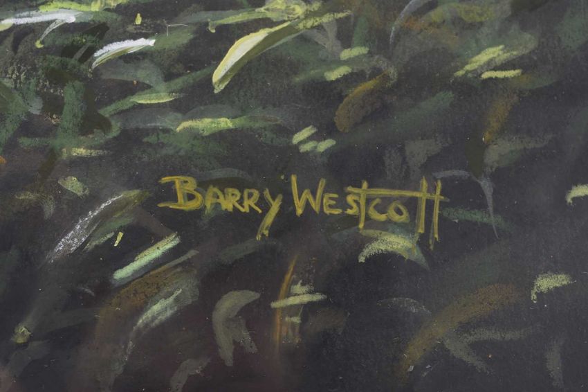 Barry Wescott (20th Century) Young Boy Relaxing at a Riverside, signed and dated '95 lower right, acrylic 56 x 110 cm, together with a further painting titled 'Calm Waters' by the same hand, 48 x 68 cm, frame 72 x 94 cm, (2)
