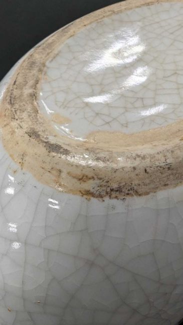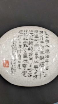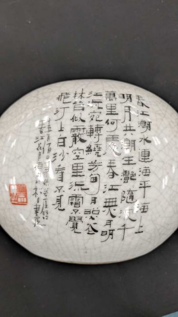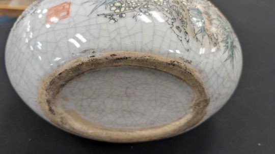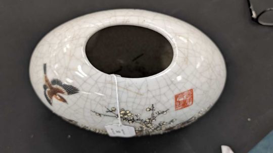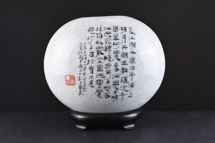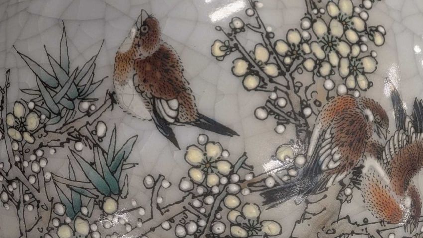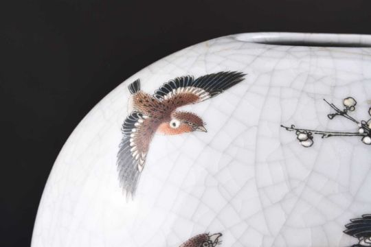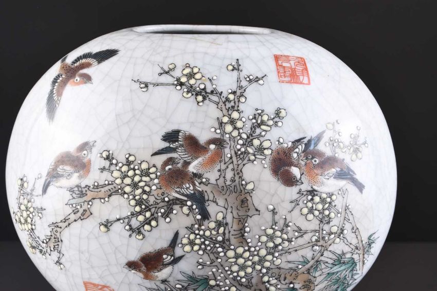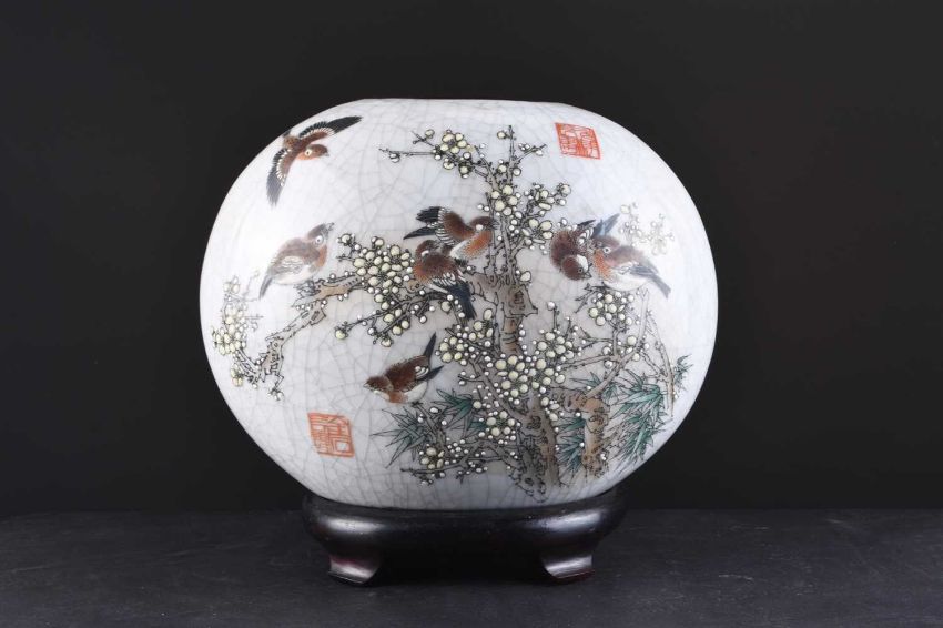 Painted in colours with birds amid flowering prunus branches, the glaze suffused with a fine 'iron wire' crackle, with hardwood stand.