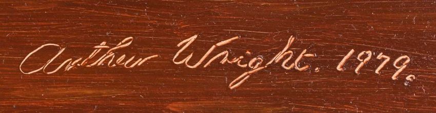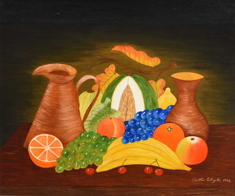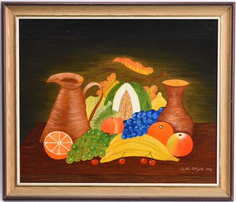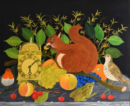 Arthur Wright (1904-1981) Still Life study of fruit and animals next to a clock, including a squirrel, thursth, frog and robin, signed and dated 1977 lower right, oil on board, 45 x 55 cm, frame 57 x 67 cm, together with, a further still life showing a jug and a vase, signed and dated 1979 lower right, oil on board, 37 x 44 cm, frame 45 x 52 cm, by the same hand (2)