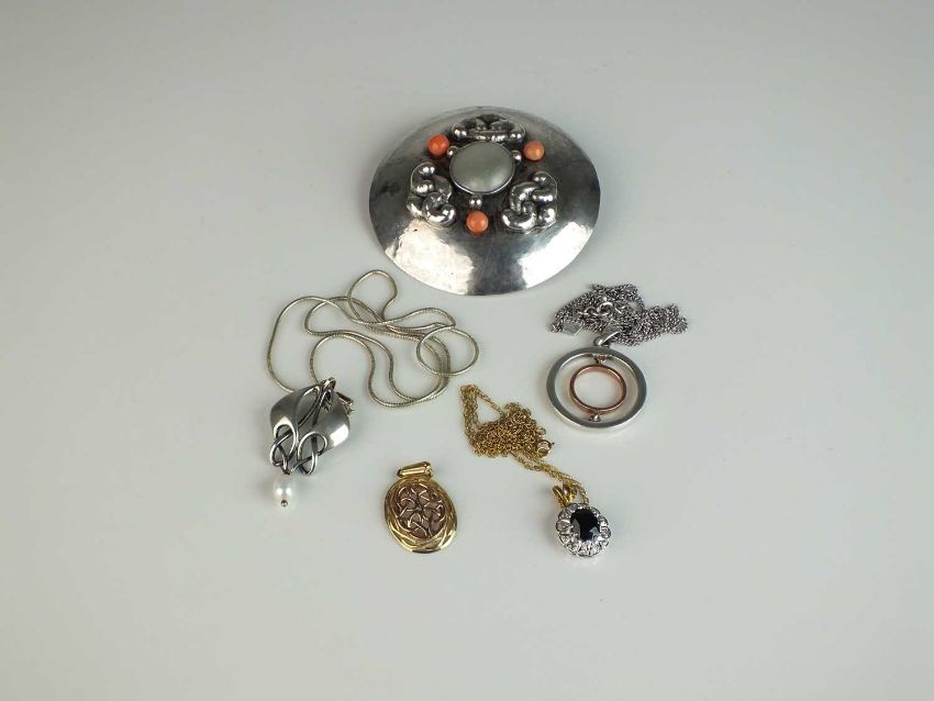A small collection of jewellery, comprising; an Arts and Crafts mother of pearl and coral set brooch, 60mm diameter, not stamped, together with a 9ct gold sapphire and diamond pendant on chain, weight approx 2.3g a 9ct gold Celtic design pendant, weight approx 1.7g, a Clogau pendant on chain and an Art Nouveau style silver pendant on chain (5)
