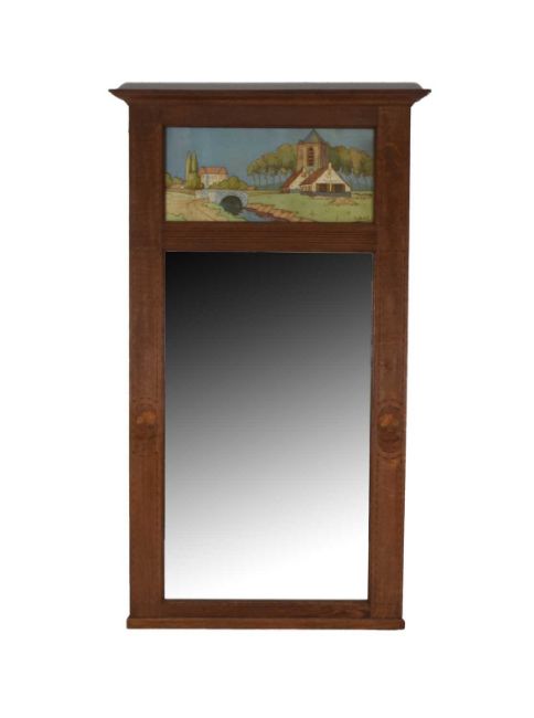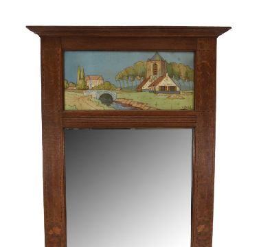 An inlaid trumeau oak wall mirror with painted panel by Robert Dutoit (1890-1944),