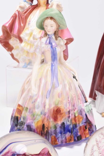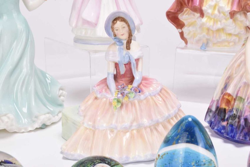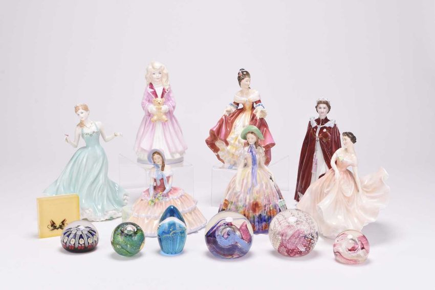 A group of five Royal Doulton figures, comprising 'Easter Day' HN2039; 'Daydreams' HN1731; 'The Polka' HN2156; Southern Belle HN2229; 'Frith', HN3082, limited edition number 7495/9,500; together with one Royal Worcester figure of Queen Elizabeth II in Coronation robes, and one Coalport lady, 'True Love', limited edition 5503/12,500; sold together with seven glass paperweights including Caithness 'Extravaganza' (group)