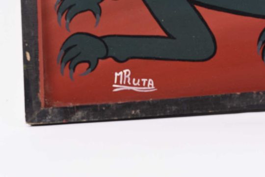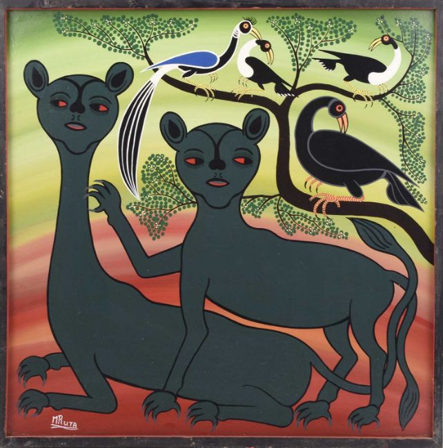 Note on the artist: Hashim Mruta had retired from the force as a policeman when Edward Saidi Tingatinga (1932-72), founder of the Tingatinga art school, started painting at the Morogoro Stores. Since Tingatinga already had five students and refused to take any more, Mruta was only allowed to watch the others painting and had to practice on his own at home. After Tingatinga's death, Mruta went on to become one of the founding members of the Tingatinga partnership and later a member of the Tingatinga Arts Cooperative Society (TACS) where he stayed until is death.