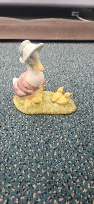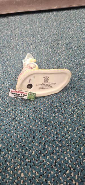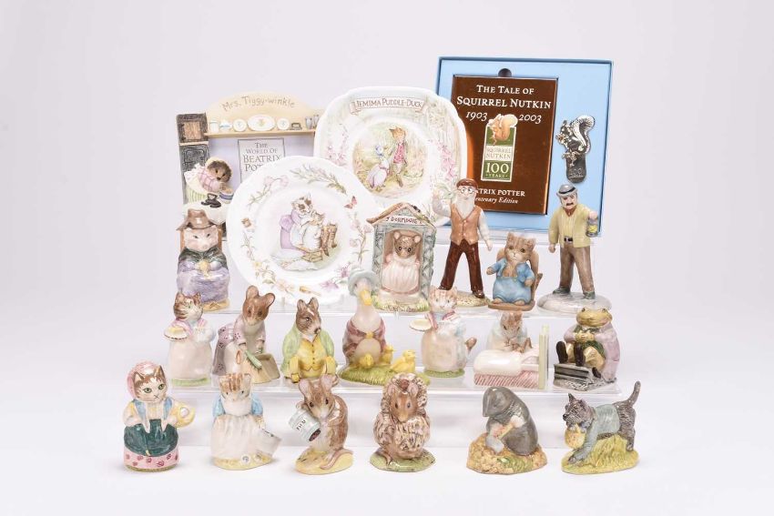 Royal Albert: Peter in Bed; Mrs Ribby; Hunca Munca Sweeping; John Joiner; Mr McGregor; Miss Doormouse and Jemima and her Ducklings; sold together with a Border Fine Arts Mrs Tiggy Winkle photograph frame (7x5), boxed; a Tale of Squirrel Nutkin Centenary Edition book and bookmark set, boxed; and two boxed Royal Albert Beatrix Potter plates (group)