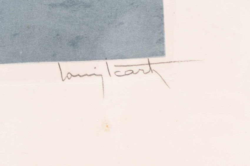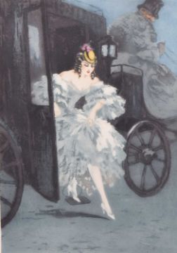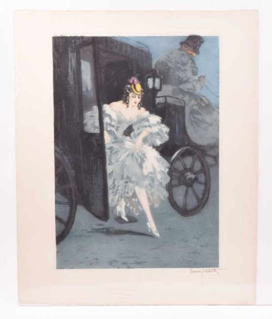 Louis Icart (1888-1950) Elegant Lady Alighting from a Carriage, signed lower right, blind stamp lower left, etching aquatint, 44.5 x 32 cm (PL), 54.5 x 44 cm (SH)