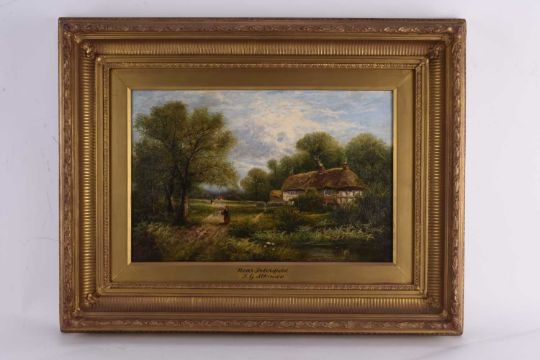 John Gunson Atkinson (act. 1849-c.1880) Near Petersfield, Hampshire, figures walking along a rural path, alongside thatched cottages, monogrammed lower left, oil on canvas, 31 x 46 cm, frame 54 x 69 cm