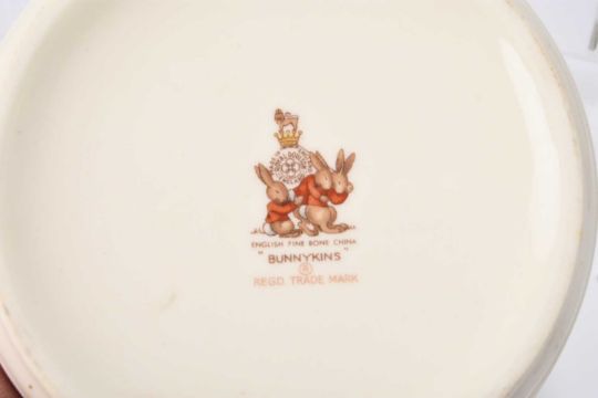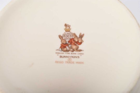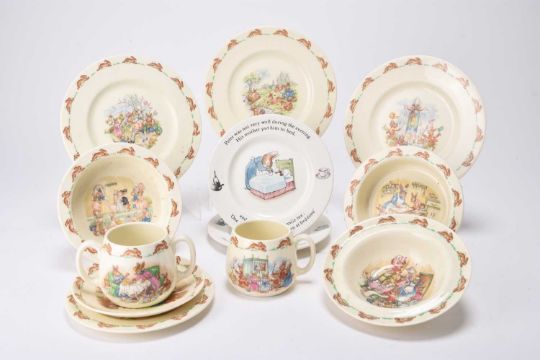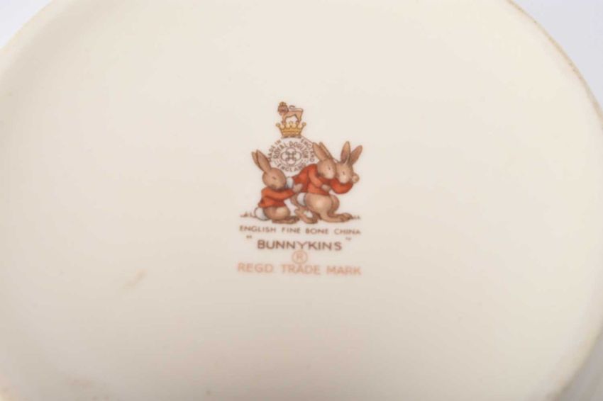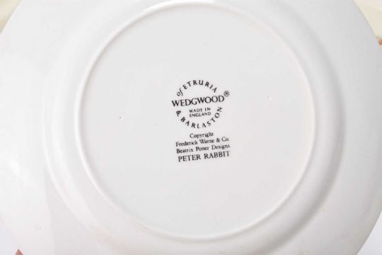 A group of Royal Doulton and Wedgwood 'Bunnykins' nursery china, comprising a twin-handled cup, a mug, saucer, sideplate, three baby's bowls, and three plates, together with two Wedgwood 'Peter Rabbit' plates (some wear to decoration)