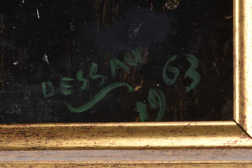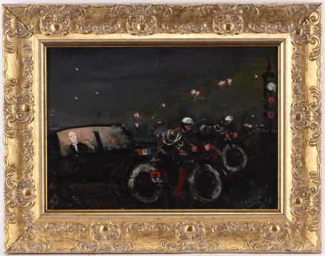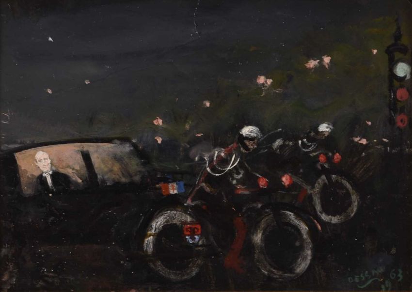 Paul Lucien Dessau (British, 1909-1999) Presidential Convoy, signed and dated 1963 lower right, oil on board 21.5 x 31 cm, frame 33 x 42 cm