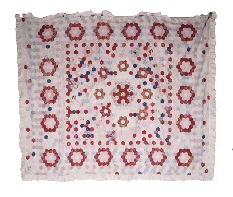 With patterned and white hexagonal patches including paisley designs, forming an all-over pattern of mixed roundels, the hem trimmed with a white ruched edging.