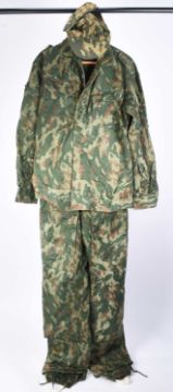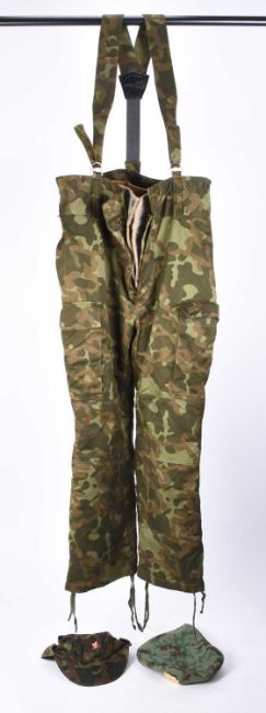 A collection of Russian Army camouflage, comprising a Soviet Army Woodland pattern pair of winter trousers plus detachable woollen lining, with a cap, circa 1980s and a suit of the Russian Federation's first camouflage pattern known variously as the VSR (Armed Forces of the Russian Federation) pattern, with a cap, plus two further USSR caps (group)