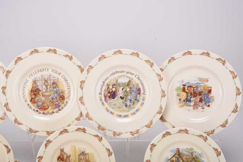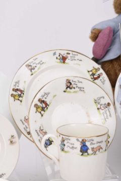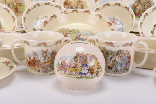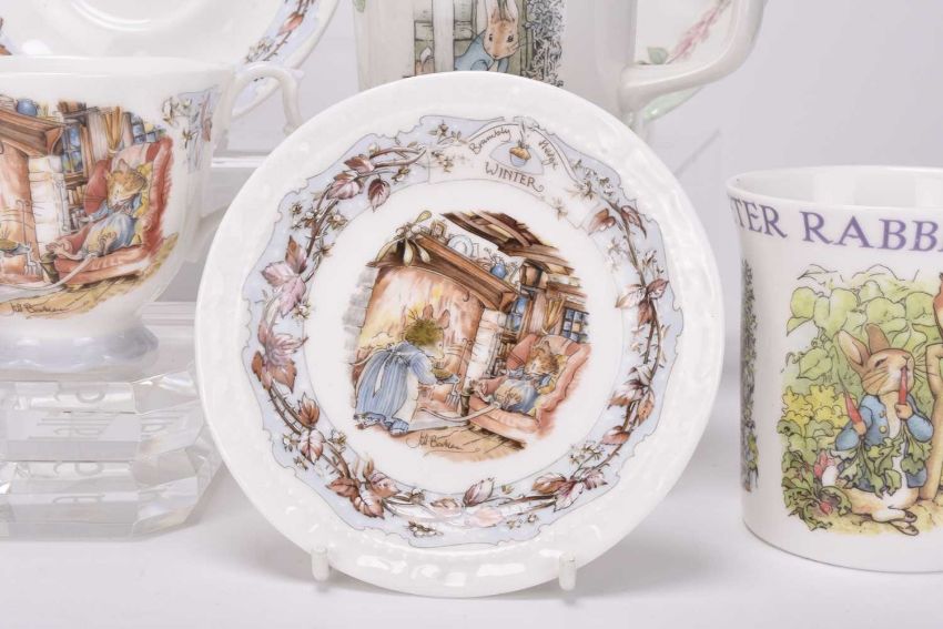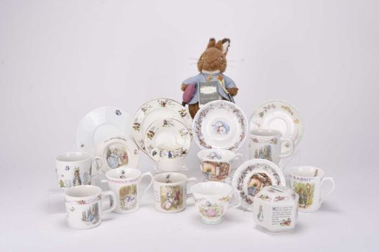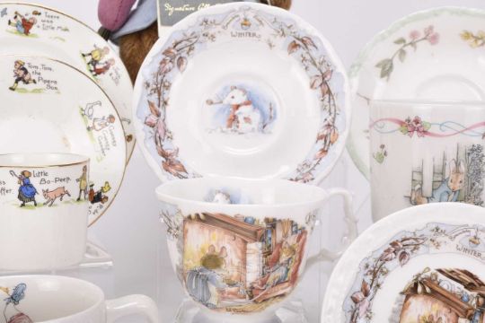 A large collection of Royal Doulton, Wedgwood and other licensed Beatrix Potter Peter Rabbit ceramics, including moneyboxes, mugs and plates, together with a Peter Rabbit framed poster, a Rainbow Designs Peter Rabbit stuffed toy, an earlier nursery rhyme trio; a quantity of Royal Doulton Bunnykins wares including baby's plates, mugs, other plates and bowls, plus two Brambly Hedge teacups and saucers (large quantity, over 92 pcs cumulatively)