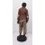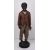 Dressed in a brownish red buttoned blazer with a white shirt underneath and plain beige trousers, standing barefeet on a circular base, he stands barefoot, dressed in a buttoned blazer and striped trousers, oval base with chip-carved border