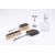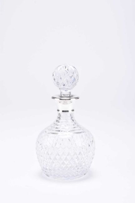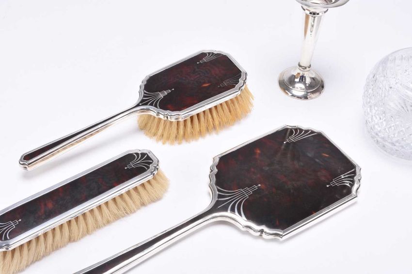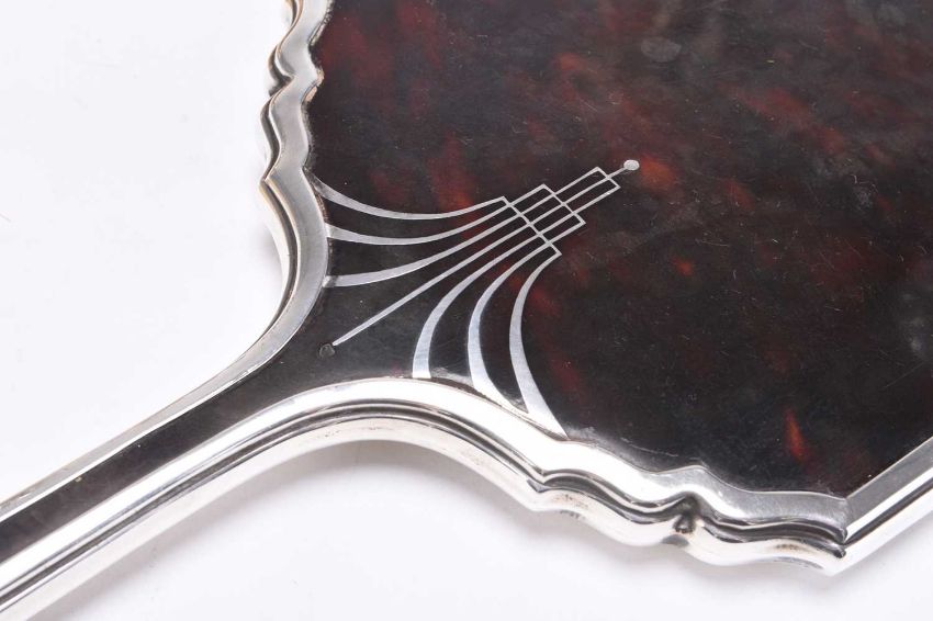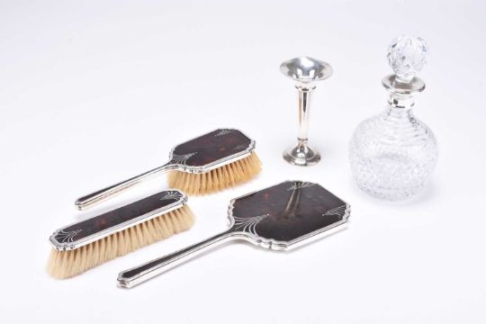 A three piece silver and tortoiseshell mounted dressing table set, Alexander Clark & Co Ltd, Birmingham 1937, comprising a hand mirror, clothes brush and hair brush, together with a silver mounted vase and a silver mounted glass decanter, Birmingham 1993 (5)